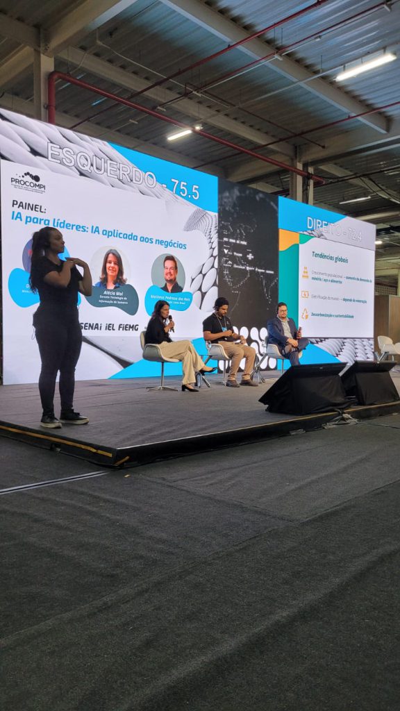 No painel “IA para Líderes: IA aplicada aos negócios”, Alécia Mol discutiu, ao lado do CEO da Fralia Cacau, Matheus Pedrosa, as transformações que a Inteligência Artificial vem promovendo nas estratégias e decisões corporativas.